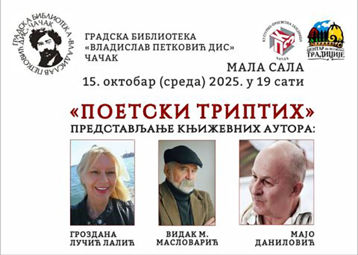 У малој сали градске библиотеке ,,Владиослав Петковић Дис“ у организацији Културно-просветне заједнице Чачак, Центра за неговање традиције и Градска библиотеке ,,Владислав Петковић Дис" одржано је представљање дела аутора Гроздане Лучић Лалић, Маја Даниловића и Видака М. Масловарића.